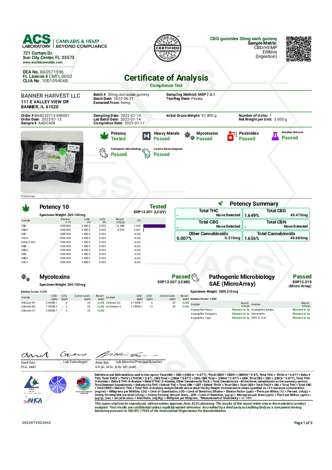 Crafted with love at our farm located in Banner, Illinois; our gummies are slow release and long lasting. Each packet contains 30 bites (in 2 separate packages of 15 each) containing 30 mg CBD isolate each bite. The bites are blended with our world-renowned Cellular Hydration and Muscle Performance powder and contain: Honey, Vitamin C, Vitamin D3, Magnesium, Sodium, Potassium, Methylsulfonylmethane (MSM). L Glutamine, Tart Cherry, Turmeric, Inulin, Stevia, MCT Oil and Hemp derived CBD Isolate.